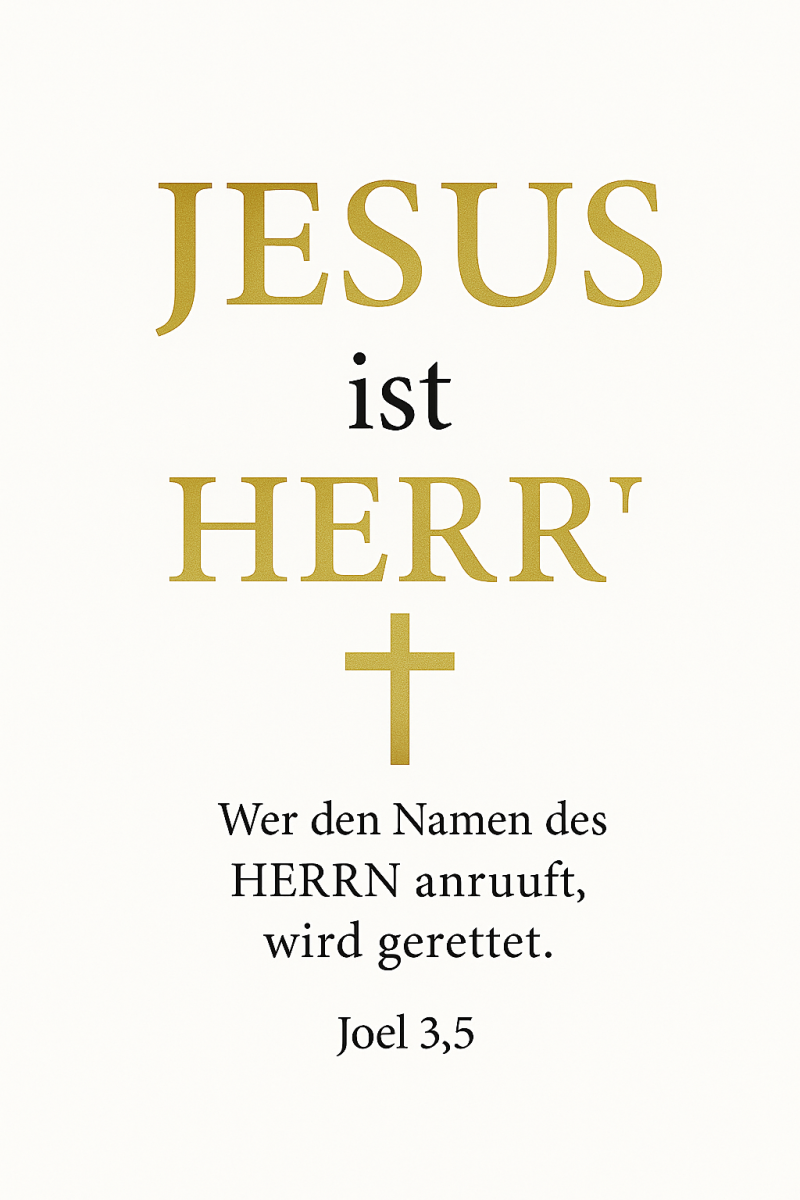 Ich verkünde: JESUS ist HERR. Nicht nur ein Titel — Vollmacht. „Mir ist alle Gewalt gegeben im Himmel und auf Erden.“ (Matthäus 28,18)